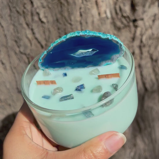 Infused with a polished Blue Agate slice and swirled with Blue Kyanite and Gray Moonstone chips, this candle captures the deep, unstoppable force of Leviathan 🌊🌀 With the aquatic Midnight Waters scent, it’s a refreshing wave of sea breeze, cool depths, and ancient ocean magic.