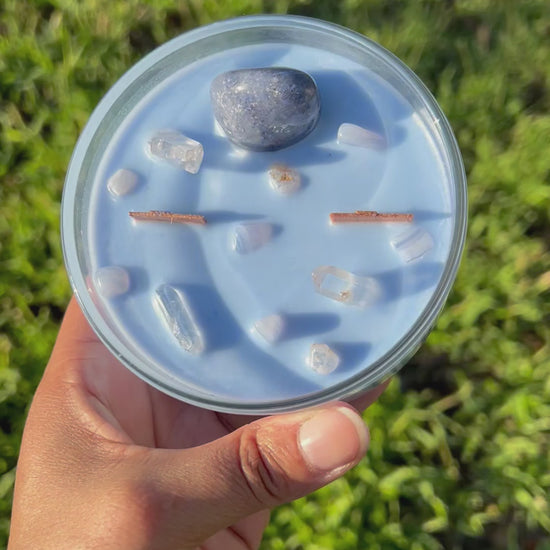 Infused with tumbled Blue Aventurine, Blue Lace Agate, and Clear Quartz points, this oceanic blend helps restore balance and flow. Sea salt, rainstorm mist, and green juniper blend into a scent as crisp as a dive into clear waters.